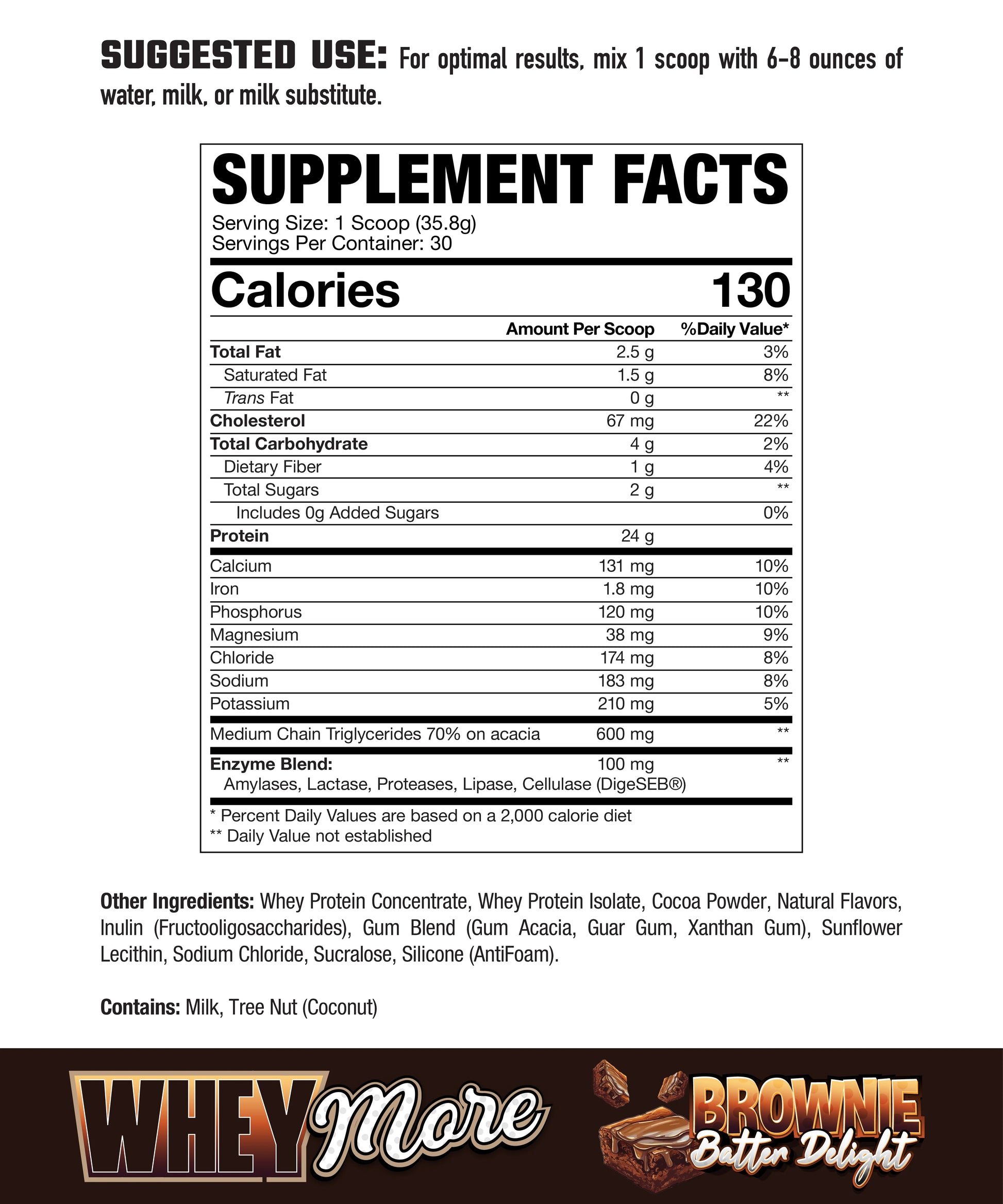 Experience the true meaning of deliciousness with Whey More - the ultimate premium protein blend! Indulge in its creamy, rich, and flavorful taste, packed with 24 grams of protein from a combination of Whey Protein Concentrate 80% and Whey Protein Isolate 90%. Plus, with added MCTs, prebiotic fiber, and DigeSEB® for optimal nutrient absorption and digestion, Whey More sets itself apart from other protein powders on the market. Try our incredible flavors, such as Grizzly Honey Graham and Brownie Batter Delight, and join our devoted community of satisfied customers who can't get enough of Whey More!