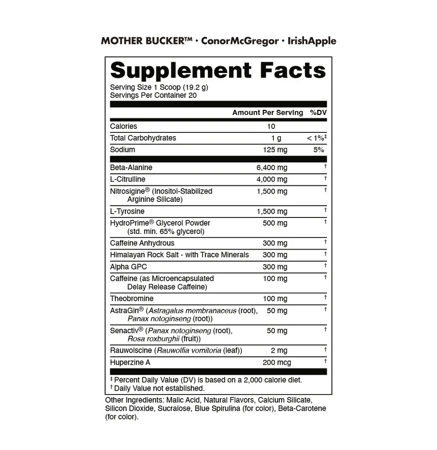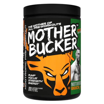Bucked Up x Conor Mcgregor Mother Bucker is a high-octane pre-workout designed for those who require intense energy and heightened focus during their training sessions. This powerful blend is tailored to meet the demands of high-intensity workouts, combining fast-acting and sustained energy sources, endurance-supporting ingredients, and focus enhancers to keep you dialed in from start to finish. It is not recommended for beginners. Key ingredients include Caffeine Anhydrous (300mg) for quick-release energy, Microencapsulated Caffeine (125mg) for extended performance, Beta-Alanine (6.4g) for endurance support and reduced muscle fatigue perception, L-Citrulline (6g) for enhanced blood flow and workout intensity, Taurine (2g) for hydration and athletic output, Nitrosigine (150mg) for increased blood flow and focused energy, L-Tyrosine (500mg) for potential mental clarity and cognitive focus