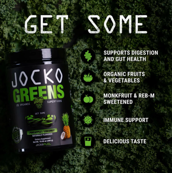 No more choking down your greens. Jocko Greens delivers all the nutrients you need with delicious taste. For better gut health, immune support, and easier digestion, Jocko Greens packs in over 20 organic superfoods, functional adaptogens, and probiotics. No fillers. No refined sugars. Naturally sweetened with fermented cane sugar (Reb-M) and monk fruit for all-natural, amazing flavors.