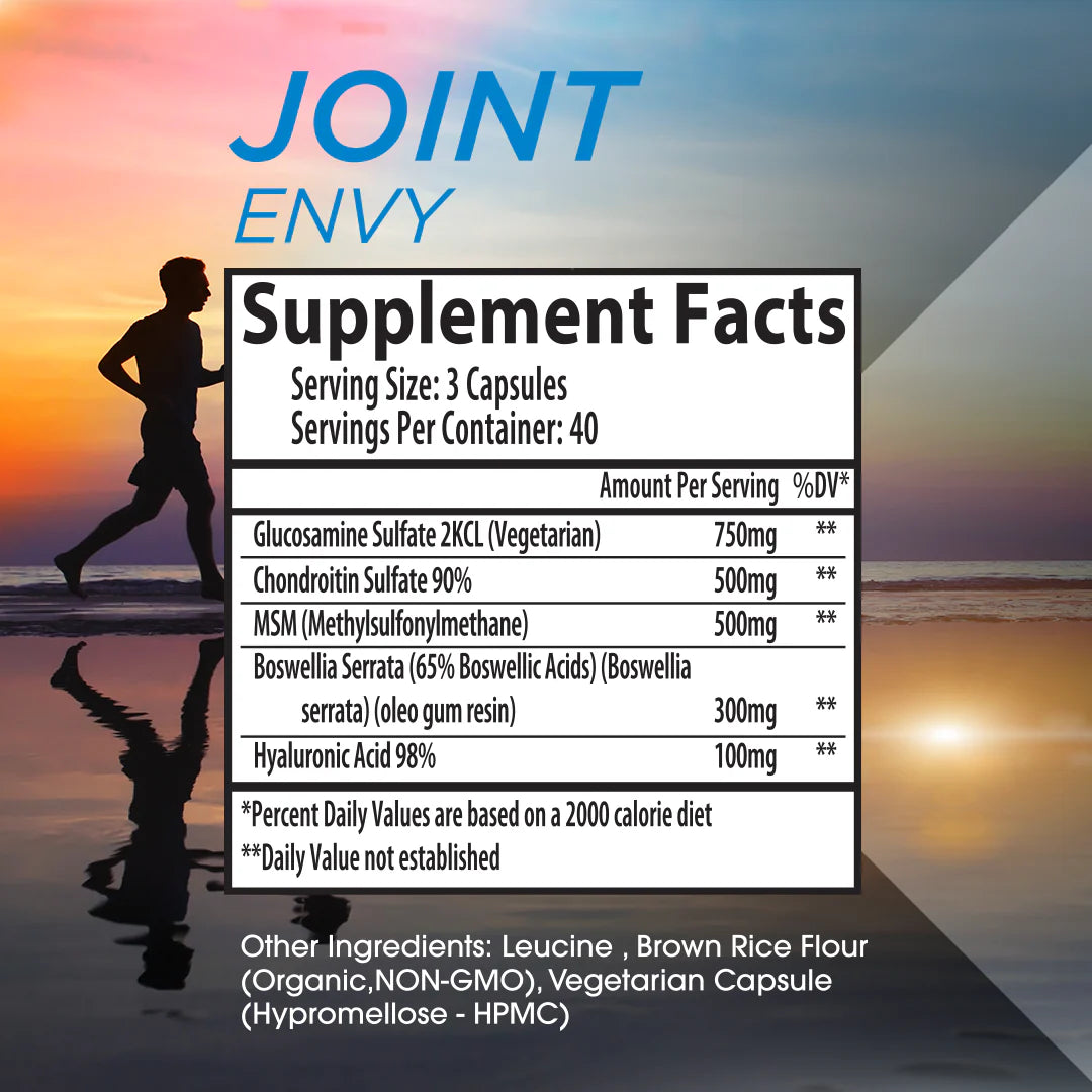 Joint Envy is a perfect combination of Glucosamine and Anti Inflammatories. Each daily dosage of 2 servings (3 capsules/serving) will provide: