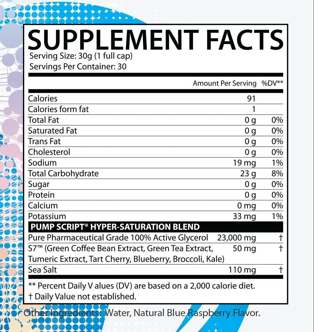 Pump Script is a liquid muscle cell volumizer engineered to maximize muscle hydration and performance. Delivering 23g of glycerol per serving at full bioavailability, it provides the dosage threshold needed for optimal muscle cell saturation—significantly exceeding powder alternatives. This first-of-its-kind hypertrophic formula offers superior value and efficacy for serious athletes seeking enhanced pump and performance.