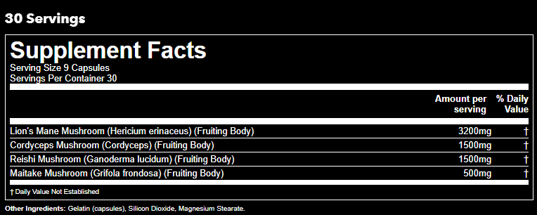 This includes a stacked profile of Lion's Mane, Cordyceps, Reishi and Maitake.
